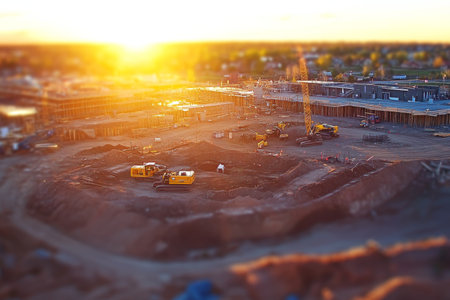 Aerial tilt shift image of a construction site captured during the golden hour lighting