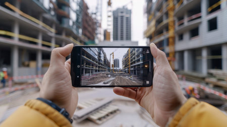 Hands holding a smartphone capturing city skyline during sunset in urban setting