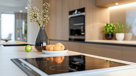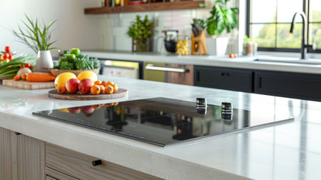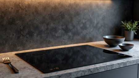 Modern kitchen with induction cooktop on marble counter and sleek gray backsplash. That the image is generated using AI.