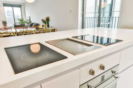 White countertop with glossy built in ceramic black induction stove, big white cupboard with built-in electrical oven in empty kitchen with nobody in sight, blurred background