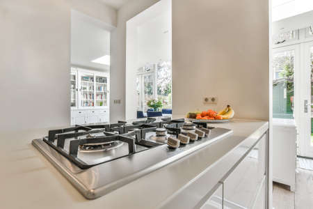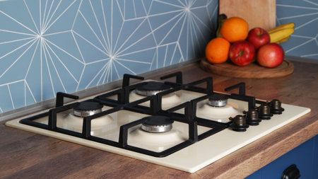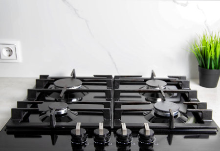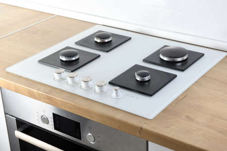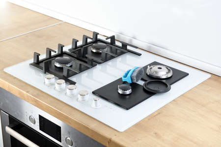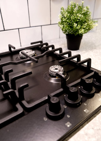Kitchen gas stove, close up. New gas stove appliance and countertop surface at modern kitchen. Modern kitchen stove cook.