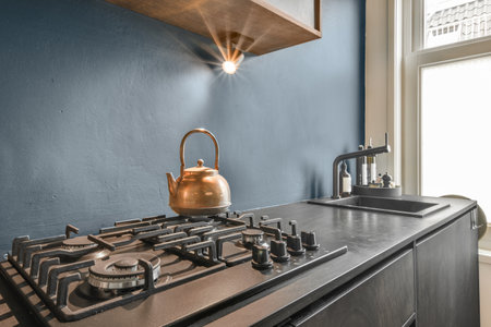 Stove burner on glossy black countertop by a window, kitchen interior with natural light, home cooking scene, authenticity inclusivity domestic appliance for culinary use
