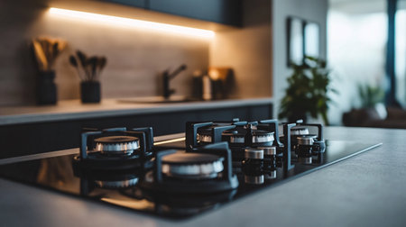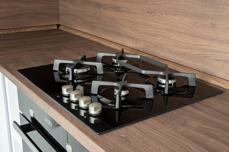 Close up shot of gas cooktop. Cooker hob with black glass surface, multiple burners and stainless steel knobs, integrated into a stylish kitchen counter with wooden cabinets, showcasing modern design