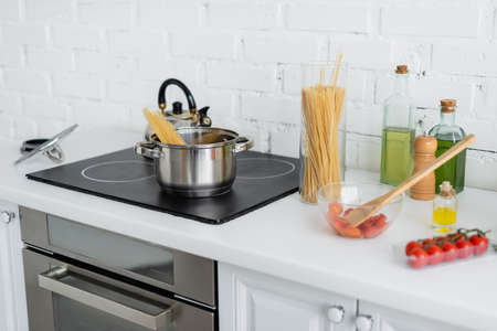 Macaroni near cherry tomatoes and saucepan on stove in kitchen
