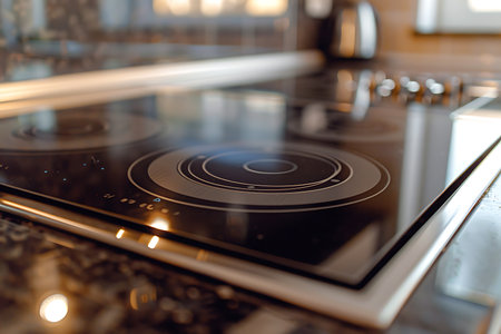 Interior of a blurred kitchen with modern electric stove, induction cook top. Closeup