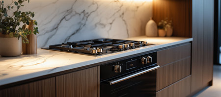 A sleek kitchen interior features a beautiful marble countertop paired with a modern gas stove, showcasing wooden cabinetry and soft lighting for an inviting atmosphere.