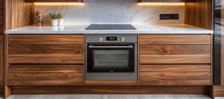 Sleek kitchen features walnut cabinets with smooth finishes, a built-in oven, and elegant countertop. Soft lighting enhances the modern aesthetic and welcoming atmosphere.