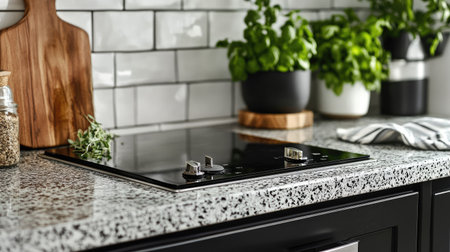 This image showcases a contemporary kitchen countertop featuring a sleek black cooktop, surrounded by fresh herbs and vibrant green plants, creating an inviting culinary space.