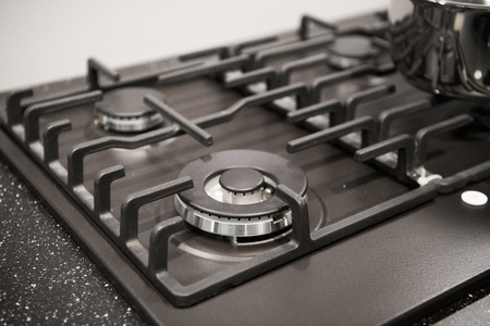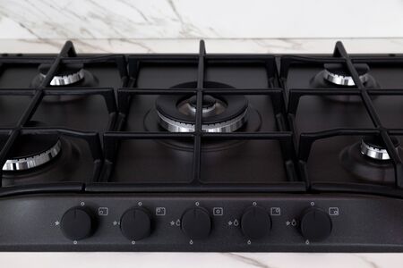 Close-up of the kitchen cooker. Black gas hob on black marble.