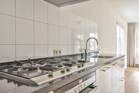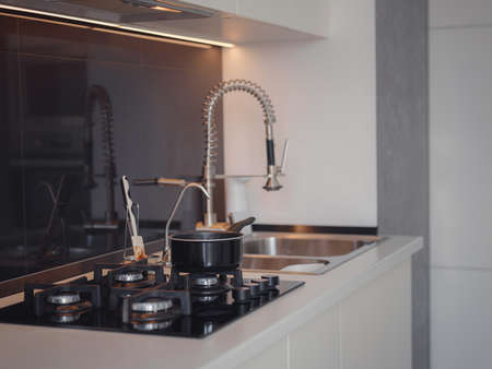 New kitchen gas stove on the black countertop and fume extractor interior furniture luxury home modern kitchen with white marble tiles wall interior contemporary
