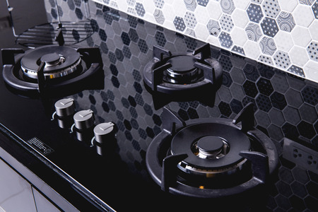 Modern gas cooking stove in modern kitchen. Black shiny finish with 3 gas heads. Modern kitchen concept.