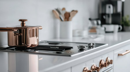 Gas cooking stove of modern home white kitchen room with design interior - cooktop, plants and cuisine elegant accessories. Stylish neutral domestic decor. Designer style concept. Copy ad text space
