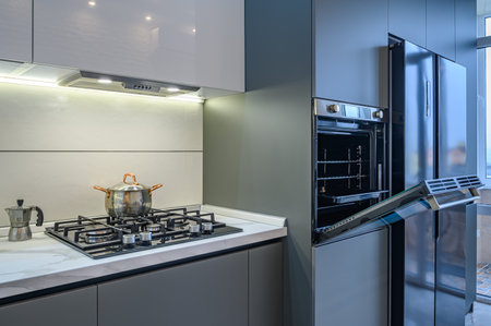 Modern kitchen with black gas stove. Interior of a modern kitchen.