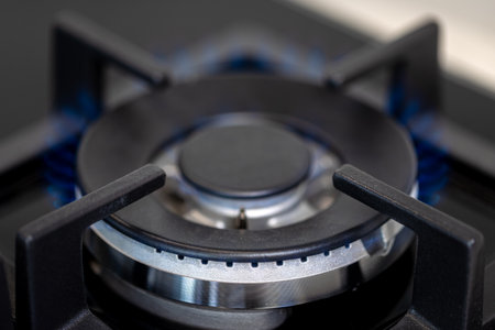Close up of Burning gas burner with blue flames on kitchen black gas stove with a bokeh effect. Dark black color and wooden Small kitchen in a modern apartment