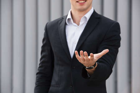 front view businessman holding hand out. Resolution and high quality beautiful photo