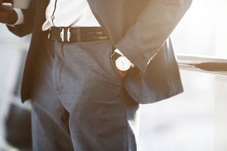business man hand in pocket with wrist watch in a business suit close up