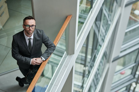 Young confident chief executive officer in formalwear standing by transparent railing in office center and looking at camera
