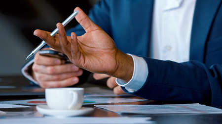 Businesspeople analyzing paper reports with diagrams. Business team standing at table, looking and pointing at documents. Closeup shot of table and hands. Analysis and teamwork concept