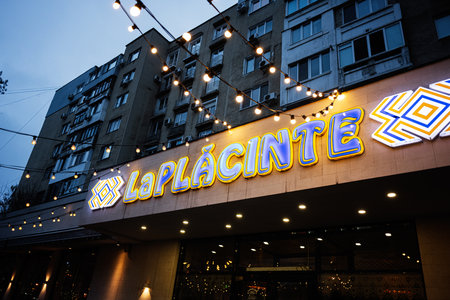 Chisinau, Moldova - November 22, 2025: Evening view of La Placinte bakery storefront in Chisinau Moldova illuminated by warm string lights.