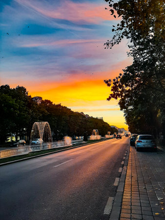 Fountain at Unirii Square in downtown of Bucharest. Unirii Boulevard in Bucharest, Romania, 2021