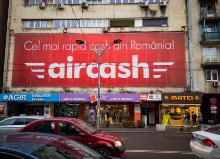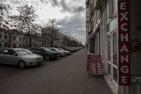 BUCHAREST, ROMANIA - FEBRUARY 15, 2020: Exchange office in downtown Bucharest, also called Schimb Valutar, with the exchange rate of the main currencies in Europe with the romanian Lei.