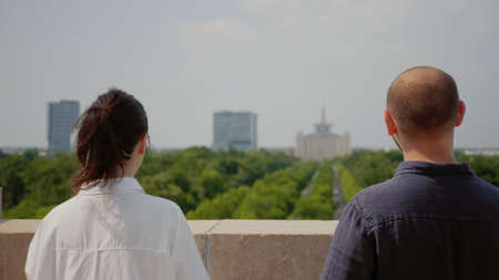 Bucharest/Romania - 05.30.2020: Young man taking a picture to his girlfriend with the water fountains in the background