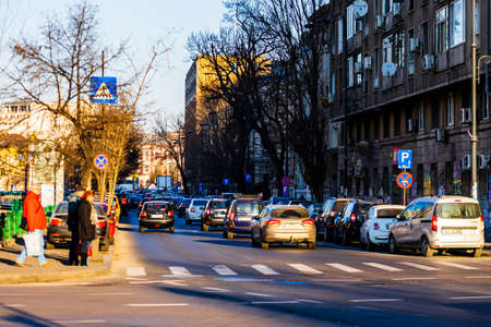 Cars in traffic at rush hour in downtown area of the city. Car pollution, traffic jam in the morning and evening in the capital city of Bucharest, Romania, 2021