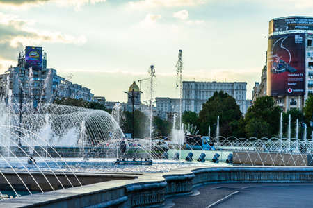 Bucharest, Romania, 4 September 2021: Decorative fountain with small water drops in Unirii Square (Piata Unirii) in the city center, in a sunny autumn day
