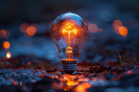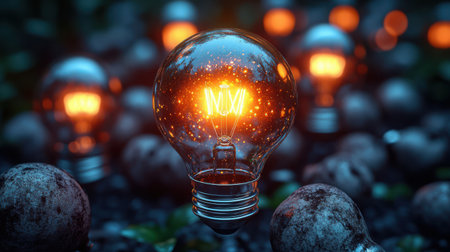 A glowing light bulb with intricate filament shines brightly on a dark, rocky surface, creating a warm and inviting atmosphere.