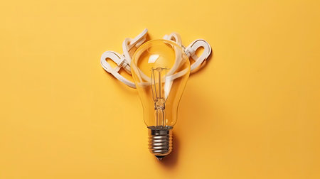 A single, classic incandescent light bulb is precisely centered on a bold, bright yellow background. The light bulb is clear glass, revealing the internal filament and metal screw base. The minimalist composition, with its strong color contrast and isolated draws immediate attention. effectively concepts such as ideas, innovation, inspiration, and energy in a simple yet striking visual metaphor. The clean studio shot emphasizes the form and symbolic meaning.