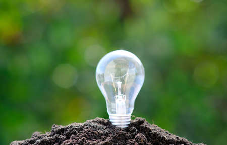 Light bulb in soil with green bokeh background, ecology concept