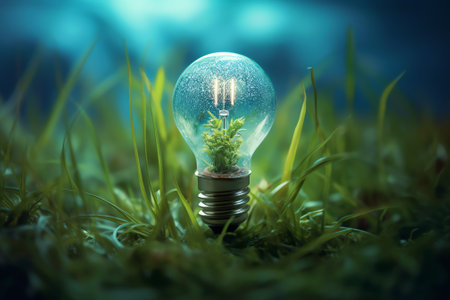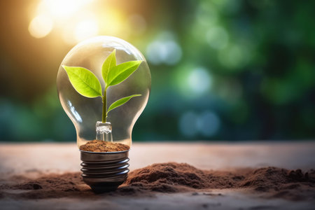 Light bulb surrounded by green leaves emerges from soil, symbolizing fusion of nature and technology. This evokes sense of innovation and environmental consciousness