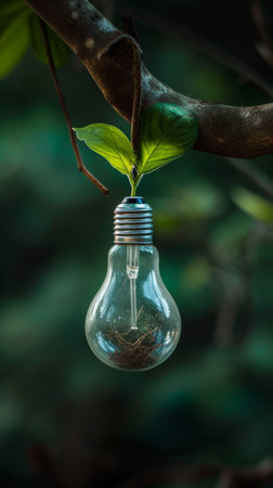 A striking image of a light bulb with a lush green tree growing from it, representing the harmony between technology and nature. This visual emphasizes sustainability and the importance of renewable energy.