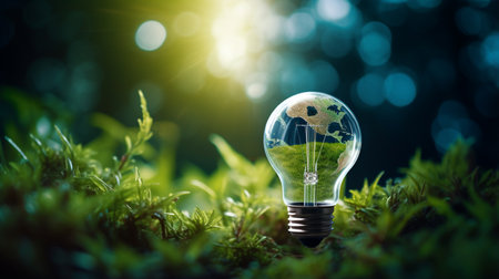 A clear light bulb rests on vibrant green moss, symbolizing the harmonious blend of nature and energy innovation, emphasizing sustainability and eco-friendliness.