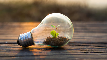 A light bulb filled with soil and a small plant sprouting from it, symbolizing the growth of ideas and sustainability.