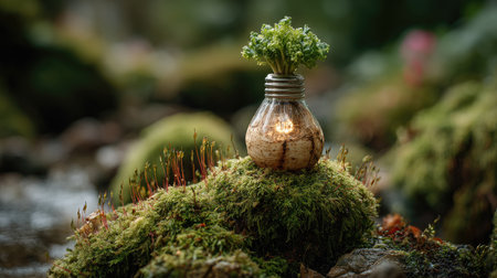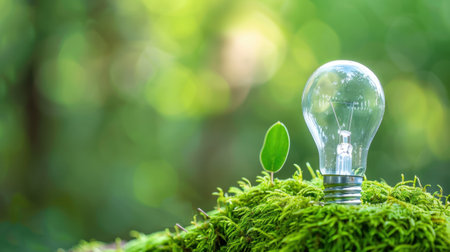 A light bulb rests on vibrant green moss, surrounded by lush leaves in a tranquil forest. This image represents the harmony of nature and innovation.