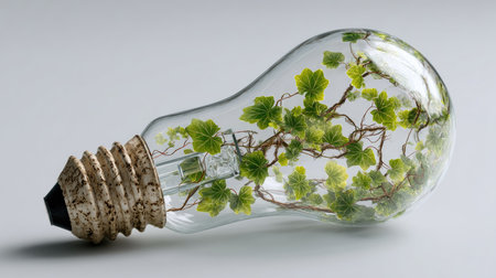 A stunning representation of nature and innovation, this image showcases a light bulb filled with ivy leaves, symbolizing eco-friendliness and sustainability.