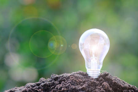 Light bulb in soil with nature bokeh background, Energy saving concept.