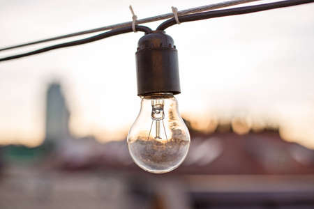 Vintage light bulbs on a the sunset background - Solar power concept. Light bulbs that are powered by photo voltaics are hanging on a balcony on a sunset background