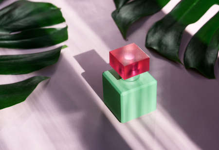 Monstera tropical leaves and a bottle of perfume on a pink background close-up using decorative light. Bright creative layout. Minimal cosmetic concept.