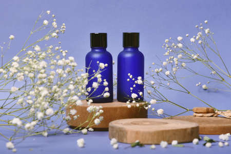 Cosmetic bottle containers packaging with product display presentation, Blank label for organic branding mock-up, Natural skincare beauty product concept.