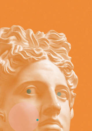 Art collage with antique sculpture of Apollo face and numbers, geometric shapes. Beauty, fashion and health theme. Science, research, discovery, technology concept. Zine culture. Pop art style.
