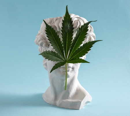 David bust vase with sprig of leaves on pink blue background. creative layout. concept pop. Minimal still life. flat lay. top view