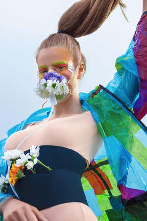 Portrait of a young, white, woman with long hair and creative art make-up, in an oxygen mask decorated with flowers