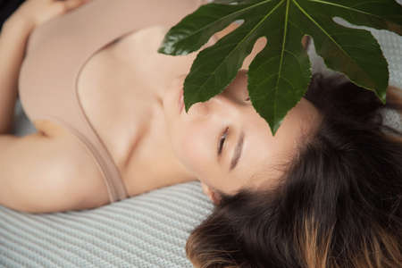 Concept skincare natural flora cosmetics. Beautiful Asian woman with smooth skin in tropical leaves in studio