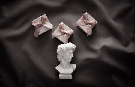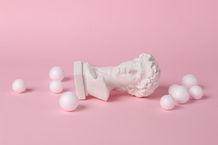 Antique bust of David with white balls on a pink background. concept pop. Minimal still life. creative ideas