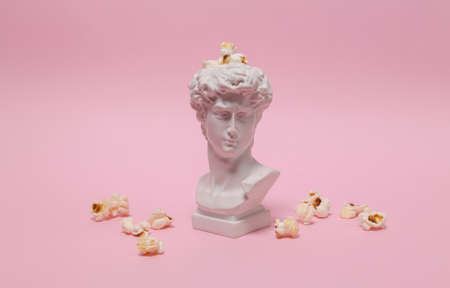 David bust with 3d glasses and popcorn on pink background. entertainment. Minimal still life. concept art