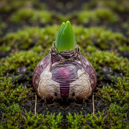 A tightly framed, symmetrical, editorial macro close-up of a single Hyacinth bulb partially buried i