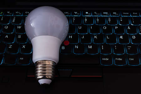Closeup Led Bulb flat lay keyboard background.Black dark keyboard background.