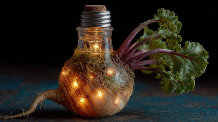 This captivating image showcases the fusion of nature and creativity, featuring a light bulb with a turnip adorned with green leaves. The whimsical design embodies the beauty of organic forms illuminated by soft lights, making it ideal for artistic projects or eco-friendly themes.